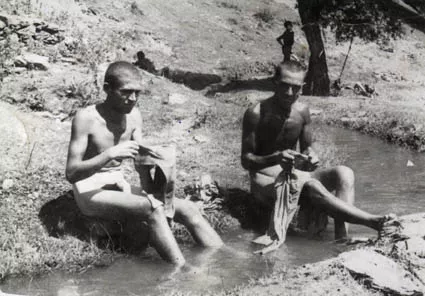 This is a photo taken during my work in the forced labor camp in Transka Klisura near the town of Breznik in 1942. I am first from left and next to me is my friend from Dupnitsa, Aron Alkalai.