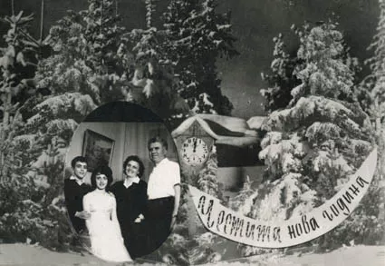 This is a photo of my family in Dupnitsa in 1965. My kids were students. First from left is my son Leon Pilosof, then my daughter Tamara Simeonova (nee Pilosof), my wife Berta Pilosof (nee Konfort) and I. [The inscription reads ‘Happy New Year’.]