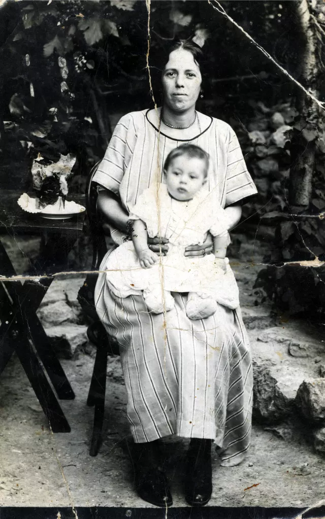 This photo was taken in 1923, the year I was born. You can see me, barely five to six months old, on my mother’s lap. I am my parents’ first child. My brother Izak was born two years after me in 1925. We lived in Yedikule then. This photo might have been taken in the street or in the garden of our house. You can see that my mother dressed me in a long dress even though I am a boy, but I understan this was common practice at the time.