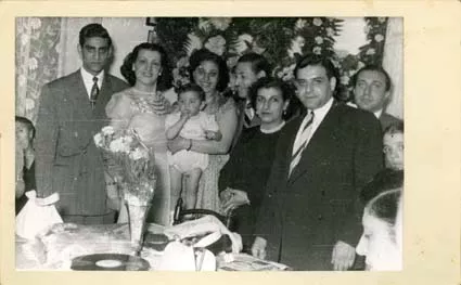This photo was taken at my brother Sami’s house in 1952. It was his engagement party at his home. On the left you can see my brother Sami Danon, beside him is his fiancee, Fortune Algazi, who later became my sister-in-law, then you can see me with my elder son Sami in my arms. My husband, Izak Sarhon is standing beside me, then Adirne Danon, my brother Vitali Danon’s wife, Vitali Danon and behind him our cousin, Sami Schilton. It was a nice engagement party at home. All relatives from their side and our side were present. We set a very nice table with wonderful food. There was dancing and lots of photos were taken. We had a wonderful time that day.