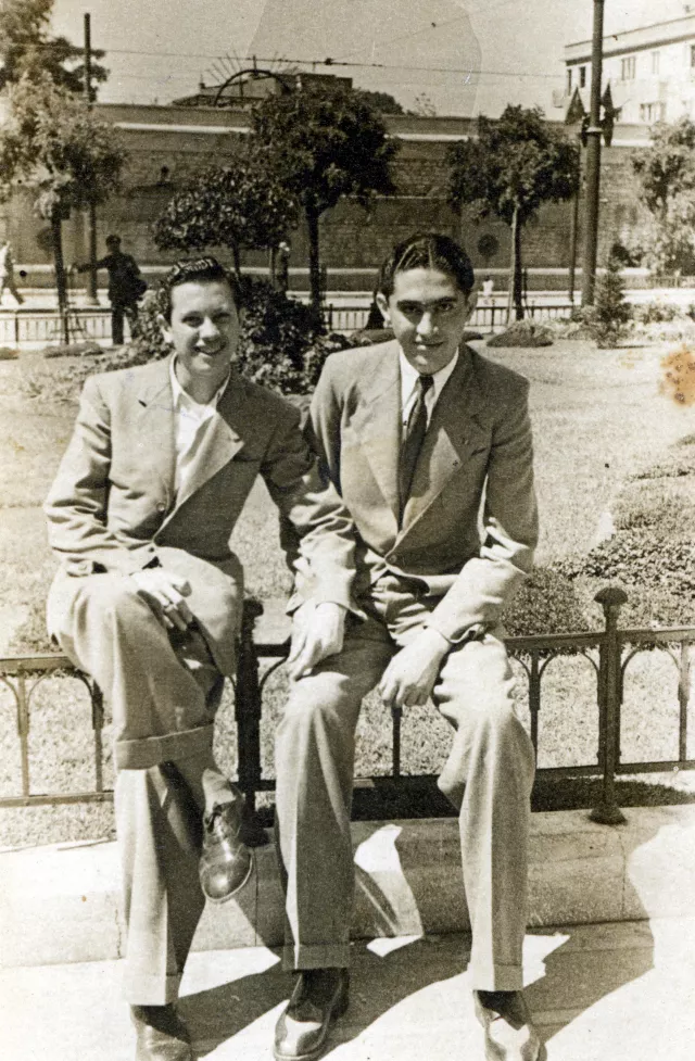 In this photo you can see me on the left and my best friend during my youth, Izak Bonofiel. The photo was taken in Taksim Square, where we went quite often for outings. The photo was taken by one of the street photographers there on 12 September 1941. I had not done my military service yet. I was working at the cloth shop belonging to the rich Farhi family in Karakoy. I did all kinds of odd jobs and measured the cloth bales. Izak Bonofiel was my best friend. They lived in Kuledibi. He was 2 years younger than me. He was very tall. He was engaged to one of the girls in our group, Suzan. They got married before I did. They had two sons. Our friendship did not go on as before after military service. I think they still live in Nisantasi.