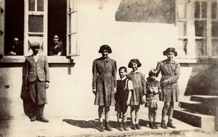 On this photo is my whole family: my parents: Abraham and Gitel König are looking trough the window. I’m standing next to them and there are my siblings: from left Dwora, Jozef, Fryda and Sara. The youngest girl, second from right was one of our lodger’s daughter. The photo was taken in Mielnica Podolska in the 1930’s. It was Dawid Szternberg who took it.