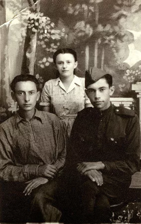 This is a photo of me and my friends from Mielnica Podolska: Izaak and Ecia. The photo was taken at that time when I came back to Mielnica after the War, so in 1946. Dawid Szternberg took this photo in his own studio. He ran such studio after the War.