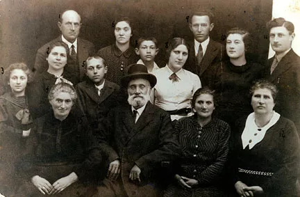 These are my maternal grandparents: Ester Fejga (first row, first from left) and Benjamin Menczer (first row, second from left) with their children and grandchildren. I’m not able to recognize all. I’m standing in third row in center, my mother - Gitel in second row, as a second from left, her brother and my uncle - Fajbisz in second row, as a first from right. The photo was taken in Mielnica Podolska in 1933. Dawid Szternberg took it.