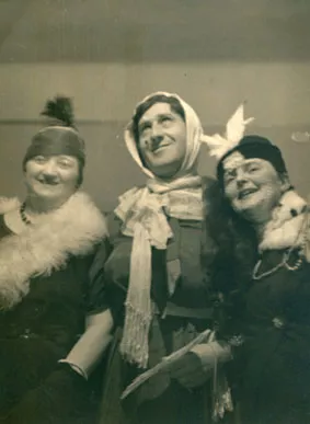 I don’t know much about this photo, because I was a married woman already. There was a large factory in Gyergyovarhegy, my brother was employed there, and there were a lot of employees with young wives. They were well off. They played cards, bridge. Back then my brother was the main bridge player. The first from left for example is the wife of the director. My brother is in the centre, he was dressed up like an old maid, and he was waiting for the suitors at the ball. And she [the first from right] was his companion. I dont’ even have to tell this, he had a feather-brush, one can see it. It was a masked ball, I don’t know if it was Purim. I wasn’t there. I was a married woman in Marosvasarhely for a long time when this photo was taken. I used to dress up at Purim, like them at the carnival. These were young wives, capable of everything, and my brother too..., he wasn’t married yet.