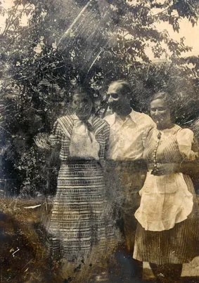 This photo was taken in my yard. This is my sister-in-law, my brother and me. This pinafore dress looks like the Tyrolese ones. The Tyrolese have a speacial dress too, a ‘deirindli’, rather Saxon. But this is not a Hungarian word. I wore this pinafore dress at home. A little camisole, white blouse, I don’t know how colored it was. This is my brother in the yard. For sure. He was visiting us. This was taken in the 1930s. My husband had a camera as well. Perhaps he took this photo.