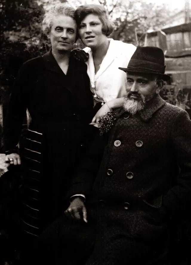 This is my mother, Sara Hudi Seiler, nee Sternschein, when she was 16, with her parents, Michael Sternschein and his wife. I don?t remember her first name. This photo was taken before mother went to Germany for the first time, to her sister Grete, to have her strabismus surgically removed. The photo was taken in the garden where they lived. I think my grandparents were in their early 60s.