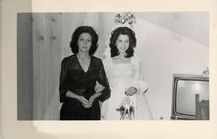 This photograph belongs to my daughter Sara’s wedding.. Stefan had sewn my outfit. Blue-violet, French lace, a blouse of the same color underneath. Navy blue shoes and handbag, and salmon colored hat. It does not show here because it is not colored. The wedding gown was sewn for Sara, a lace wedding gown. It is a picture taken in '72. I and my older sister's husband held the thallis. The husband of my older sister held the thallis for me and my daughter in this way.