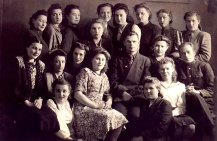 Me among my co-students of Kiev Technological College of Silicates. Middle row, 2nd on the left is my friend Vera Zinder. When we were 1st-year students we were photographed with our group. Kiev, 1940.