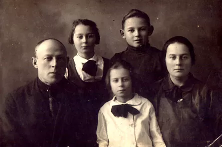 Our family, the Shylmans. From left to right: my father Duvid Shylman, I, Surah-Leya Shylman, my sister Golda Shylman, my brother Boris Shylman, my mother Ghitlia Shylman. We were photographed to send this photo to father's sister Leika in Ostrozhok. Photo shop in Krasnoarmeyskaya Street, Kiev, 1930.