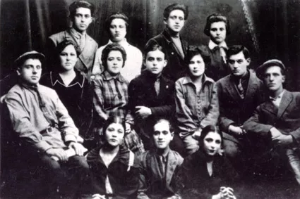 This is the Jewish amateur theater in Kamenets-Podolskiy. This photo was taken in Kamenets-Podolskiy in 1930 . My husband Wolf Muller is the first on the left in the upper row, his brother Gershl Muller is on the right in the lower row. There is no information about the others, but it is known that 8 of the people in the photo perished during the Holocaust.