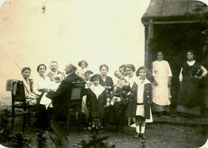 I think this picture was taken in Aknaszlatina, Ukraine. We used to go there in the summer, there was a salt-bath there. The picture was taken when our family was together. The two little girls in the front are my sisters Anna Kaufmann, the eldest, and Margit Kaufmann, the second eldest, between them is me on my mother's lap, while the little girl in the background [behind the table] is my cousin Klari Schongut, the third from the left is Uncle Sandor, one of my uncles, next to him is Aunt Vilma, Emil Schongut's wife, while on the right is Oti, our German maid. I don't remember the others.