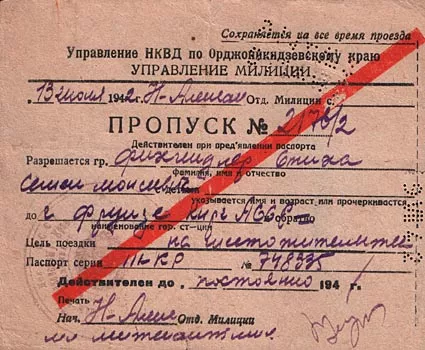 This is a pass issued to my father, Semyon Fichgendler, by the chief of militia of Novoalexandrovsk district, Stavropol region, to travel to Frunze town of the Kyrgyz SSR for permanent residence. The pass was issued on 13th July 1942.