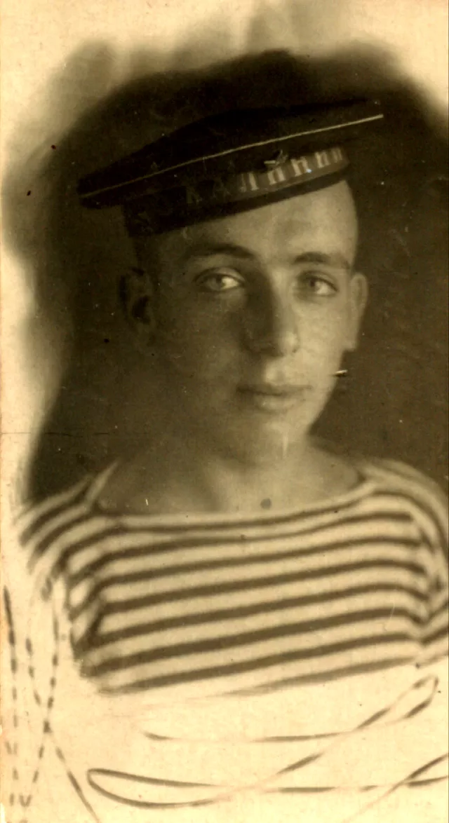 This is me photographed in the uniform of Soviet Navy shortly after I was recruited to the army in Vladivostok on 15 October 1945. There is a name of my cruiser 'Kalinin' on my cap.