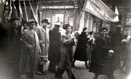 My colleagues and I (wearing a black hat) at the parade on 1st May. This photo was taken in Kiev approximately in 1960.