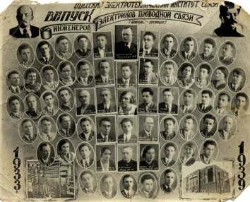 This is me Semyon Tilipman ( the first from right in 4th row) at the photograph of graduates of the Faculty of Wire Communication of Odessa Electric Engineering Communications College. This photo was taken in Odessa in 1939. The second from right in the 1st row is my friend Akiva Averbuch, the first from left in 6th row is my friend Zhora Schwartz, the first from left in 6th row is Fyodor Tomchakovski. I left home in Minsk on the first day of the Great Patriotic War on 22 June 1941 with this photo in my pocket and kept it with me through the whole period of the war.