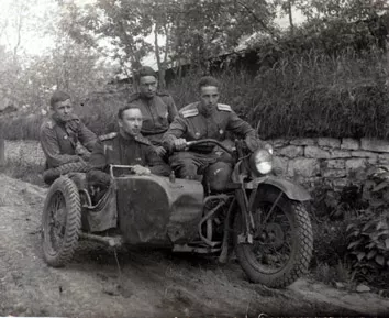 This is me, Semyon Tilipman (first from right), and my fellow comrades captain Yunoshev (in the side-car) and captain Zhuk (behind me). This photo was taken in Chernyatin, Chernovtsy region, after our troops liberated Chernovtsy in May-June 1944.