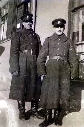 Two brothers - soldiers: Isroel and I on our leave from the army. The photograph was taken in Veisiejai in 1937.