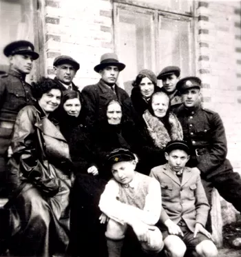 This is our family in front of our house in Veisiejai. The picture was taken in 1936 on the occasion of my army leave. In the bottom row are the sons of my aunt Rohl Ruth, Meishe and Yankel. In the second row from left to right standing: Rohl's daughter Bella in leather coat, my sister Esther Aronovich is behind her, then my grandmother Mihle Fleisher, my mother Perl Berznitskaya and my brother Isroel in military uniform. In the top row from left to right: I, dressed in military uniform, next to me is Esther's husband Alter Aronovich, then my elder brother Yankel Berznitskiy, my sister Sheina, and behind her is my younger brother Iosif Berznitskiy with a cap on his head.