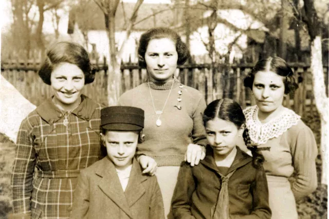 This is a photograph of the Königsberg siblings, but my mother, Lola, isn't among them. She was the oldest of them all, and so basically took care of them. I unfortunately don't know where and when this photo was taken. Aunt Toshka, who lived in Israel, is at the far right, on her right is her sister Lea, and Dina is at the far left. The two little ones in the front are Bracha and David.