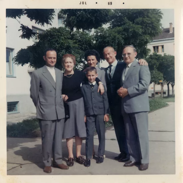 This picture was taken when our uncle from America, Sigmund Engler, my mother's step-brother, came to visit us. In the background you can see the apartment on Gheorghe Doja Street where we used to live in Targu Mures. The first from the right, wearing glasses, is my brother, Hary Margulies; Uncle Sigmund is the one next to him; the lady in the middle is Hary's wife, Elena Zavate; their son, Arthur, is in front of her. I'm the one to the left. The elderly lady next to me is my mother, Antonia Margulies. The photo was probably taken at the beginning of the 1970s.
