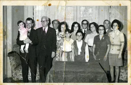The other people in the photograph: Yuda Romano, Sima. It was taken in the home of my older sister. Meri Ciprut’s (maiden name Sarfati) engagement party. Now she is in Israel. In my lap is Sima. Luna Romano is on the very right. Sima had started walking. The two Ines’ are next to each other, the older one and the younger one in front. My older sister’s daughter and my daughter.