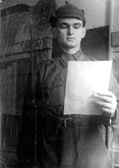This is me, Solomon Manevich, photographed during the ceremony of oath of allegiance in Saratov. I mailed this photo to my mother in Kiev. This photo is signed 'To my dearly loved mother from Solik, Saratov, 10 December 1940. I am taking an oath'.