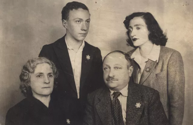 These are my parents, Solomon and Rebecca Saltiel, and my brother Yako Saltiel with my eldest brother Albert's wife. They are all wearing yellow stars, so the Law for the Protection of the Nation was already in force. The photo was taken in 1943 in Sofia.