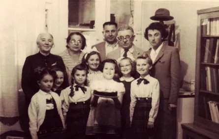 Behind the children the one on the left is my mother's aunt, Sophie Gingold, and the others are all Jewish children with their parents and grandparents. Aunt Sophie taught the Talmud Torah, Yiddish in Suceava, and the children were probably her students. The picture was taken in Suceava, on the 8th June 1958. On the back it is written: 'Riri 7 Jahre', so probably the girl holding the cake was called Riri and they were celebrating her birthday.