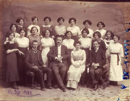 This is a picture of my mother's aunt, who was a teacher of German and Yiddish, and was called Sophie Gingold. She is the fourth from left in the first row of students. This is a picture taken at the Teacher's Training College, as it was called at that time, in Cernauti. On the picture you can see the date the 9th August 1943, but it was surely made much earlier, because aunt Sophie was born in 1888, and she was still a student here.