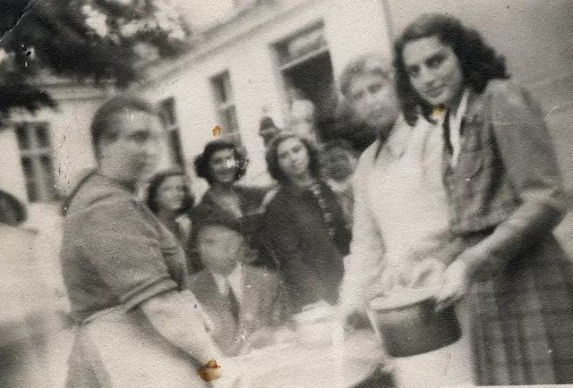 A soup kitchen in Pazardzhik in 1944. I?m in the back with the coat. To the front, on the right, is my friend Liska Natan. I don't know the others. The photo was taken on the school campus. An inscription in pen says: 1944. Giving aid to the interned at a soup kitchen in Pazardzhik.?