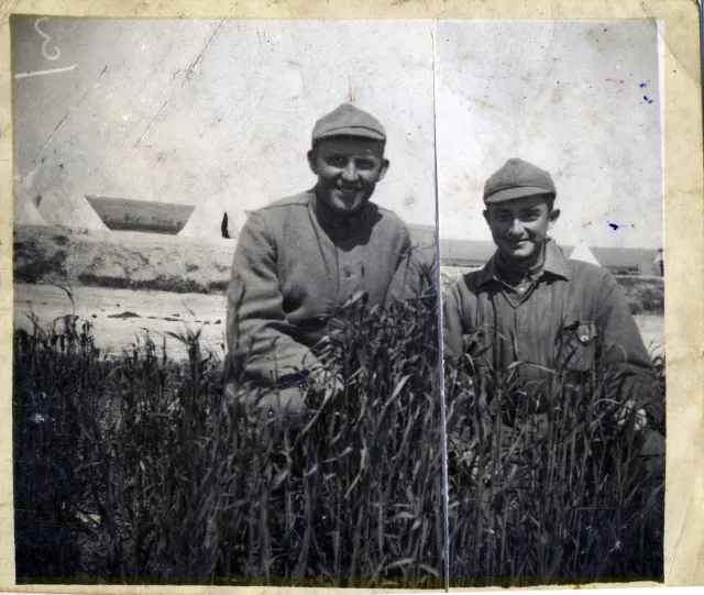 I was called to military service between 1942 and 1945. I was a soldier in the 3rd regiment of the 2. Airforce battalion for 36 months, i.e. 3 years. In the first year of this period, we built the Malatya airport by mixing sand with cement and water. In the following 6 months, we dug gutters that were 2 m. deep in Adana airport to drain rainwater and filled them up with stones. The next 6 months I was a "writer" in the Çanakkale Bölügü(regiment). I would take roll call every morning and evening. I would look for runaways, I would grant doctor's visits to the sick ones. Here also they were building an airport, the soldiers were working under harsh conditions. These soldiers needed 2000 calories a day, I took care of the food supply. I spent the next year in Yakack Samandra [a neighborhood on the Asian side], and the last six months in Zonguldak Kokaksu as the writer of the regiment. There were quite a few Jewish youth from Izmir and Istanbul in this regiment. I met the friend next to me in the photograph here, his name was Negrin Rividin, we lost touch later on, where is he, what does he do, I have no idea.