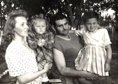 This is our family. From left to right: my wife Adel holding our daughter Adela; I, Stepan Neuman, with my older daughter Judita . We were photographed in the summer of 1957 in the yard of our house in Uzhgorod.