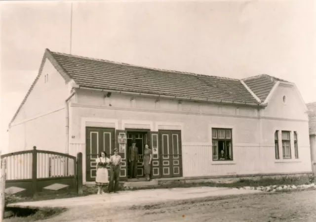 The photo was taken in 1941 in Gyergyoszarhegy. This was our family house and the store. In front of the entrance to this shop, from left are my siblings, Dora Struhl and Andor Simon (born Struhl), at the entrance: my father, Arnold Struhl, and my sister, Hermin Struhl, in the window my mother, Fanni Struhl, nee Pascal.