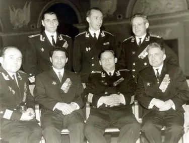 Standing from left to right: Baboshin Eugeny (died); Chernov Yury (died); Novimzon Abram (he lives in Haifa). The photo was taken in the Naval School named after Frunze on the 9th of May (the Victory Day) in 1970s.