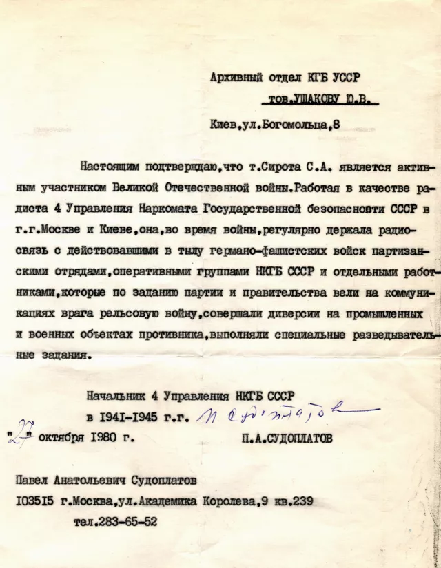 This is to confirm that comrade Sirota S.V. was an active participant of the Great Patriotic War. She worked as a radio operator in the 4th department of the people's commissariat of state security of the USSR in Moscow and Kiev and maintained communications with partisan units, operational groups of NKGB USSR and individual employees in the rear of German fascist troops that performed the tasks issued by the Party and Government, destroying infrastructure lines of the enemy, industrial and military facilities of the enemy and performed special intelligence tasks.
