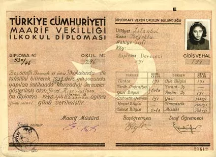 This is a primary school diploma. They gave me this diploma in 1940 when I finished primary school. It says here I was awarded this diploma as a result of the final tests I took at the end of the 1939-1940 school year. At that time, we had to pass tests at the end of primary, secondary and lycee. It appears I took tests on the following subjects: Turkish, History, Geography, Social Sciences, Arithmetic, Geometry, Natural Sciences, and Family Sciences. And I got grades for Music, Gym and Calligraphy. Overall I got the grade of “Good”.