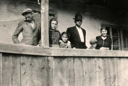 The photo was taken in Saratel, on the veranda of our house. The first from right is my mother, she was around thirty-nine years old; she had a net on her head, and a little hair in the front, so one couldn’t notice that her hair was cut. Next to her is standing my little brother, Salamon. He didn’t go to school yet, he attended the cheder though. Then the person with a hat is my father; he was handsome. The little girl next to my father is Mirjam. On the left side is my eldest brother, David, and I’m standing next to him; I was fifteen years old. I had chestnut plaits, I had long hair; my mother braided it into two plaits, then plaited it together, fixed it up, and tied it with two pink ribbons.