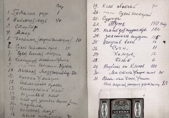 This is the table of contents of my father Aron Breido's copy-book with family formulas of household chemical compositions. Below is the label for black Indian ink, which was produced in 1931-1934 at the chemical enterprise of the Regional Children's Commission in Voronezh, where my father's brother German Breido was exiled. German's ‘Indian ink’ formula was also included in father's copy-book.