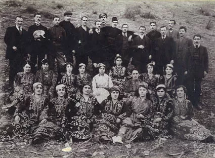 This is a photo of Jews from Dupnitsa. The picture was taken around 1915. The women are wearing 'bindali' costumes. They were sewn from a cloth similar to velvet, in which tinsel was woven. This was the traditional Jewish costume. My mother also had one. My mother's costume was dark green.