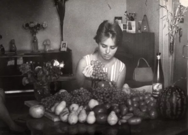 This is my daughter Tatiana Kasymova. This photo was taken in Kishinev in 1972. Tatiana was a 3rd year student of the Leningrad Medical Pediatric College at the time. She was going back to Leningrad after having vacations and we prepared all these fruit for her.