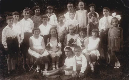 This photo was taken in 1933 at the children's party in the park in Riga on Ligo or Jan's Day, a national holiday in Latvia. There were games and entertainment for children. I'm the first on the right, with a white ribbon. My cousin Mikhail Wolpe, Mama’s sister Ida's son, is on my left. And there is Glika Freidus, Mama’s sister Ida's daughter. She was visiting us then. I don't know the other children. That was a group of children taking part in a contest, and we were photographed together.