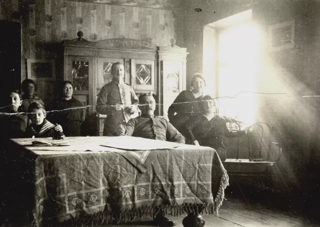 This picture was taken in the room of my maternal grandparents in Jonava: to the right sitting is my mother Taube Pagirskaya, standing next to her is her sister Masha Pagirskaya. The third to the right sitting is mother's brother Benjamin Pagirskiy, next to him their brother Haim Itshak Pagirskiy, the next is sister Frida and the first to the left standing is younger brother David. I do not know the rest. The picture was made in Jonava in the 1910s.