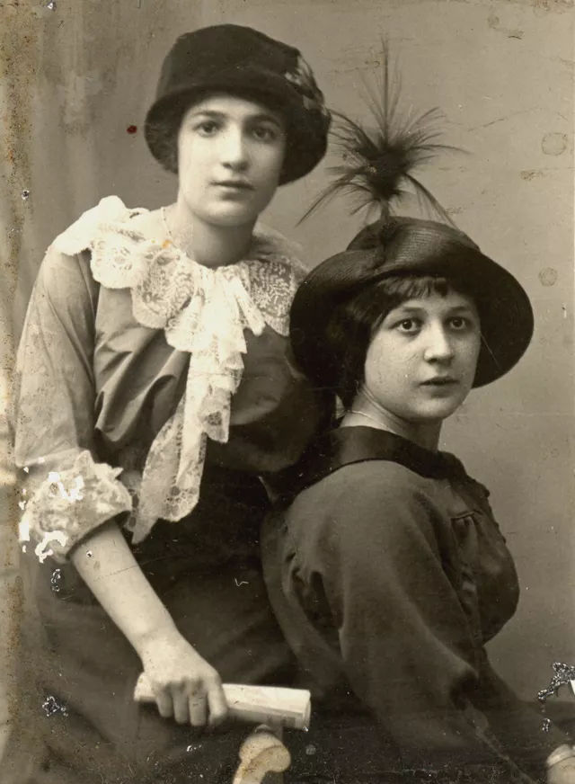 To the right is my mother Taube Pagirskaya with her friend. The picture was made in Jonava in 1920. I do not know anything about her friend.