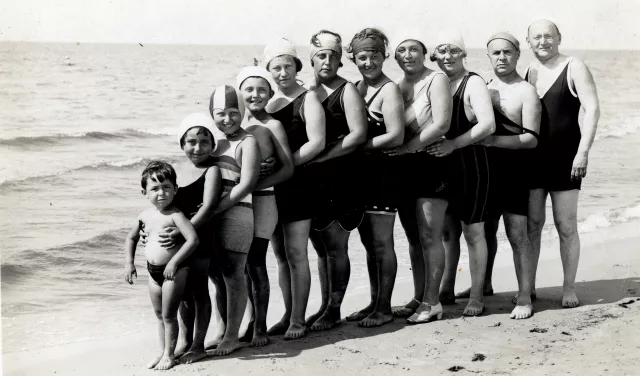 This is the so-called 'train'. The company of children and parents from our house often went to spend a weekend on the coast of the Baltic Sea. That was the way the photographers had the people align so that everybody could fit in the picture. Children are standing to the left - the first is my brother David Yudelevich, the children of neighbors are behind him: Fira Amsterdamskaya, Boris and Efim Hainson. The first to the right is our neighbor and family friend Evsey (he was killed in action during Great Patriotic War, he was on the side of the allies), my father Abram Yudelevich, the), Amsterdamskiy (I do not know anything about him, not even the name), Hainson 's wife (I do not know what happened to her), my mother Taube Yudelevich, and her sister Masha Granevich. 1927, Kemery.