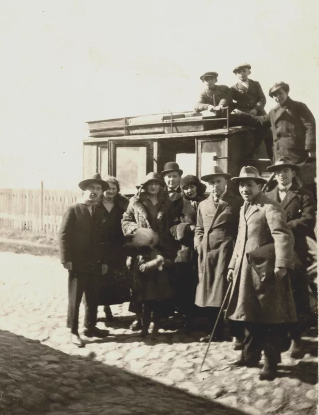 The picture was made by the bus traveling between Jonava and Kaunas. The first to the left is father's brother Isaac Yudelevich, the fifth to the left is my mother Taube, next to her is my father Abram Yudelevich. The rest were just fellow travelers. The photo was made on their way to Kaunas in 1924.