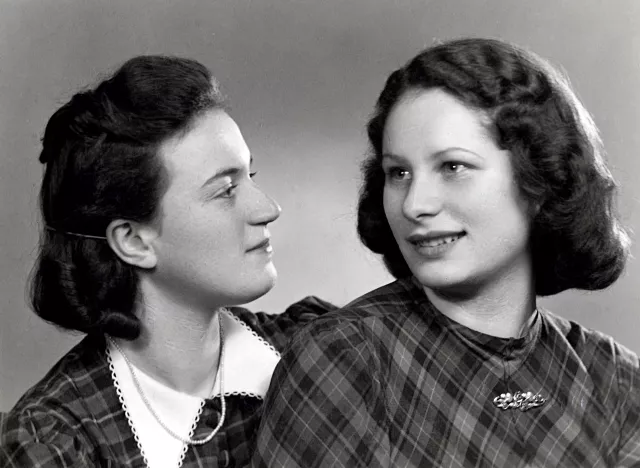 This is me, and the girl on the right is my schoolmate Lusia Helzel. The picture was taken shortly before the war, probably in 1939, in Cracow.