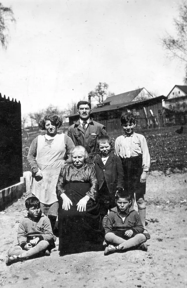 This is a photograph of my entire family. The strapping man in the picture is my father, Marek Thüeberger. The woman in the apron is my mother, Anna Thüebergerova (nee Rauchbergerova). The boys sitting on the ground are my brothers Karel and Max Thüeberger. The woman sitting in the middle is Grandma Rauchbergerova. The boy standing beside her chair is my cousin Max Rauchberger and standing beside him am I. The photo was taken in Radvanice in the 1930s.