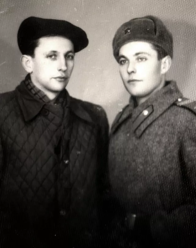 This is me, Tibor Gohman (on the right, wearing a military uniform of a soldier of the Soviet army), and my older brother Miklos Gohman. This photo was taken in Uzhhorod in 1953 when I came home in Mukachevo on leave from the army in the Far East. Miklosh and I were photographed so that I could show this photograph to my wife Valentina Novikova who was waiting for me in Vladivostok.