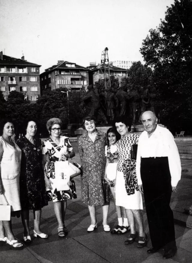 From left to right is me, my sister Liza Mois Levi, nee Iakova, a visiting cousin from the USA, my sister Milka Mois Aroyo, nee Iakova, her granddaughter, my sister Stela Mois Iakova (nee Iakova) and Shmil, Milka's husband. The photo was taken in Sofia in 1974 in front of the Monument of the Soviet Army. All my sisters lived in Sofia and we often gathered. I cannot remember the specific occasion for this photo, but the Monument of the Soviet Army is near the central park in Sofia, which was also a favorite place for walks.